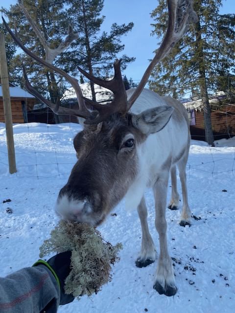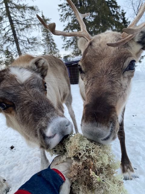 Halfway through, we’ll stop for a traditional Swedish fika — coffee, chocolate or tea served with something sweet. This is also the perfect moment to switch drivers if you’re sharing a snowmobile. Our guide will help capture photos of your experience, so you can take the memories home with you. As our snowmobile adventure winds down, we visit some of our family’s reindeers. Standing quietly in the snow to welcome us with gentle curiosity, Here, you’ll have the chance to feed the reindeers and here you can ask your guide questions about Sami life.